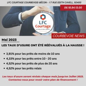 En répercussion de la revalorisation mensualisée du taux d'usure, le taux moyen des crédits a donc de nouveau progressé rapidement. C'est pourquoi il est important de se faire accompagner par un de nos collaborateurs LFC Courtage ! N'hésitez pas à…