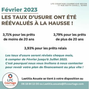 Pour ce mois de Février 2023, les taux d’usure ont été réévalués ! * Les crédits de moins 20 ans sont à 3,71% * Les crédits supérieurs ou égals à 20 ans sont à 3,79%, * Les prêts relais sont…
